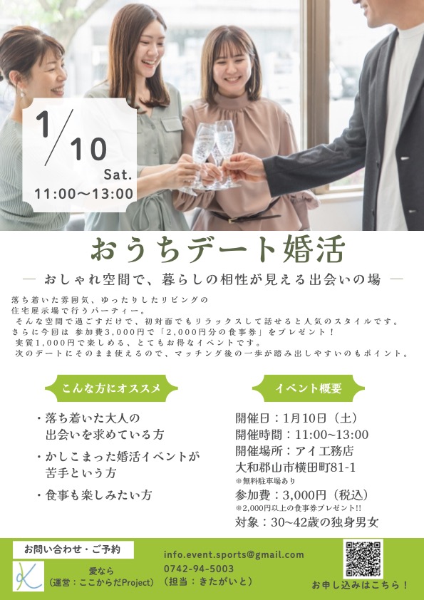 | おうちデート婚活 開催日時:1月10日(土)11:00 〜13:00(受付 10:30〜) 主催者:愛なら |