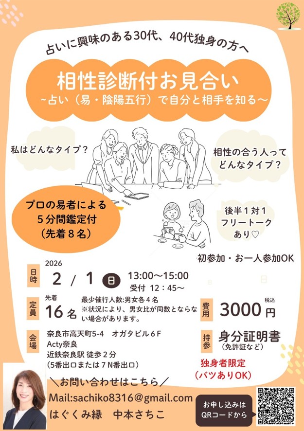 | 相性診断付お見合い〜占い(易・陰陽五行)で自分と相手を知る〜 プロ易者による個別鑑定5分間付(先着8名) 開催日時:2 月 1 日( 日 )13 : 00 〜 15 : 00 (受付 12 : 45 〜) 主催者:はぐくみ縁 |